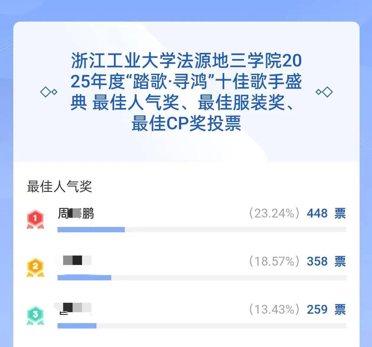 10日上午,极目新闻记者了解到,涉事学生为浙江工业大学法学院的一名学生,参加的是由该校多个学院联合举办的2025“踏歌·寻鸿”十佳歌手比赛。该生在7日的决赛中获得季军,并取得“最佳人气奖”第一名。