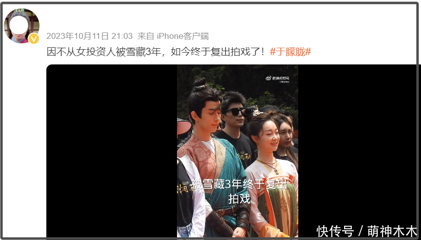 此前,曾有爆料称于朦胧被雪藏3年,在2023年正式复出拍戏,主演了古装剧《一伞烟雨》,而被雪藏的缘由传是拒绝了女投资人。当然也有粉丝称是天娱资源分配出问题,对其不够重视。