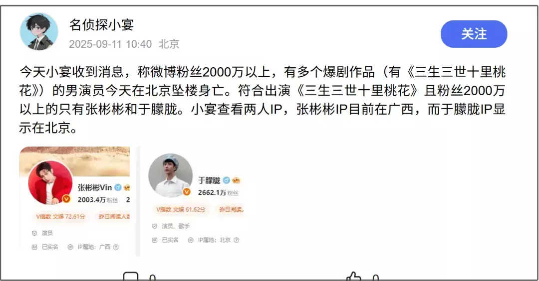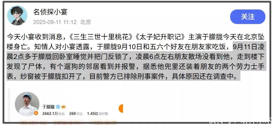 9月11日股票配资行业讨论,突然有多位网友爆料称于朦胧跳楼身亡,随后狗仔称某出演过《三生三世十里桃花》且粉丝数超过2000万的男演员在北京坠楼死亡,引发热议。