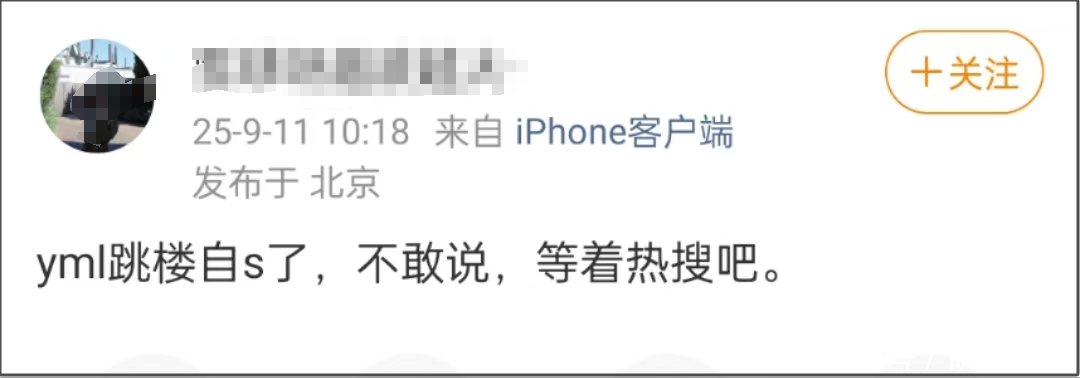 除了狗仔爆料外,也有北京IP的网友用缩写的方式发文“YML跳楼自S,等着热搜”爆料。而该网友的发布时间比狗仔要早,不知是不是知情人。另外一位四川的网友也在于朦胧的社媒评论区留言称“他已经去天堂了”。